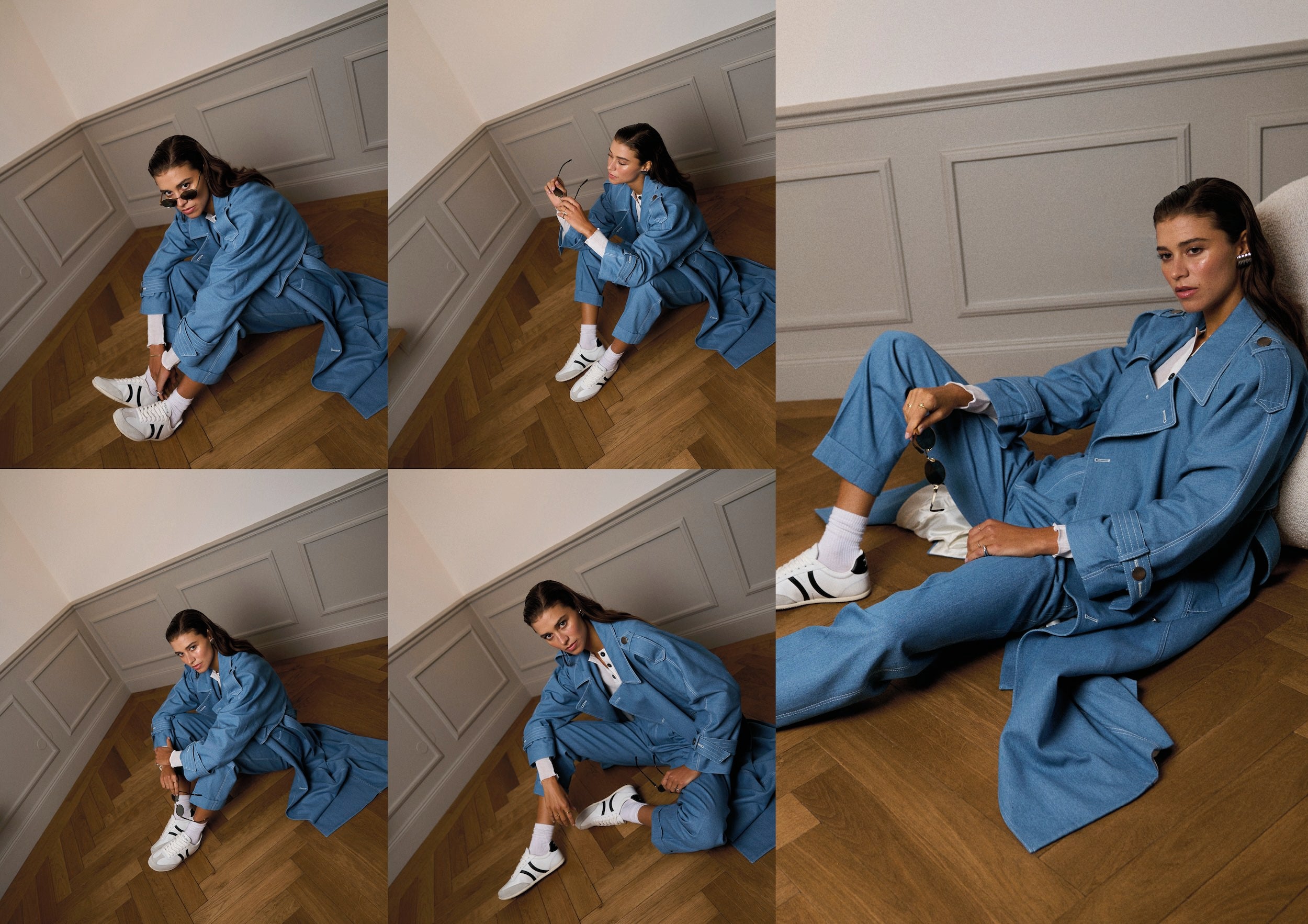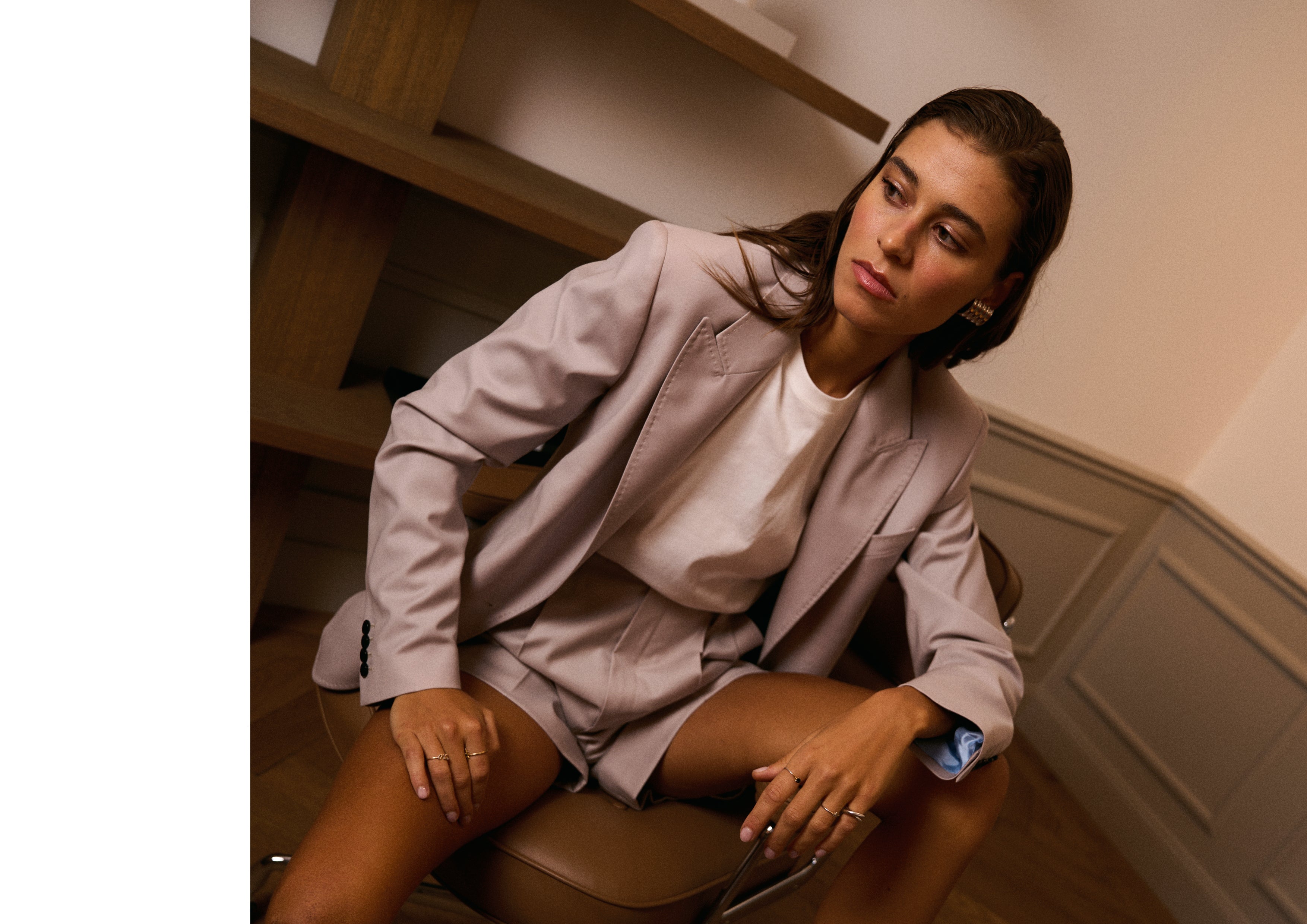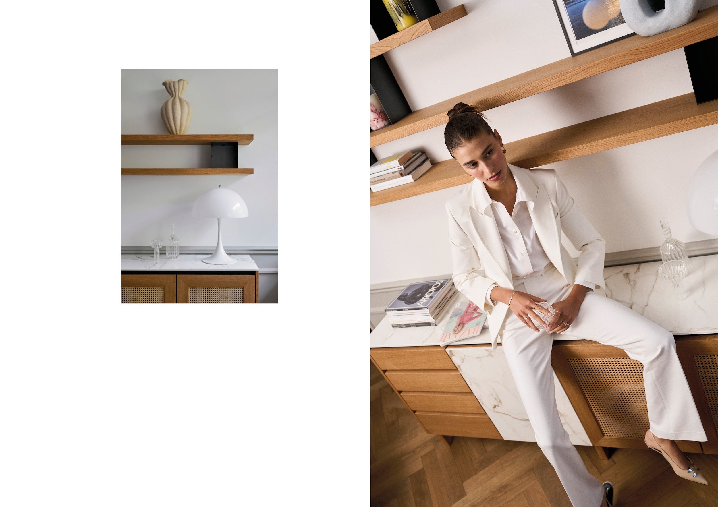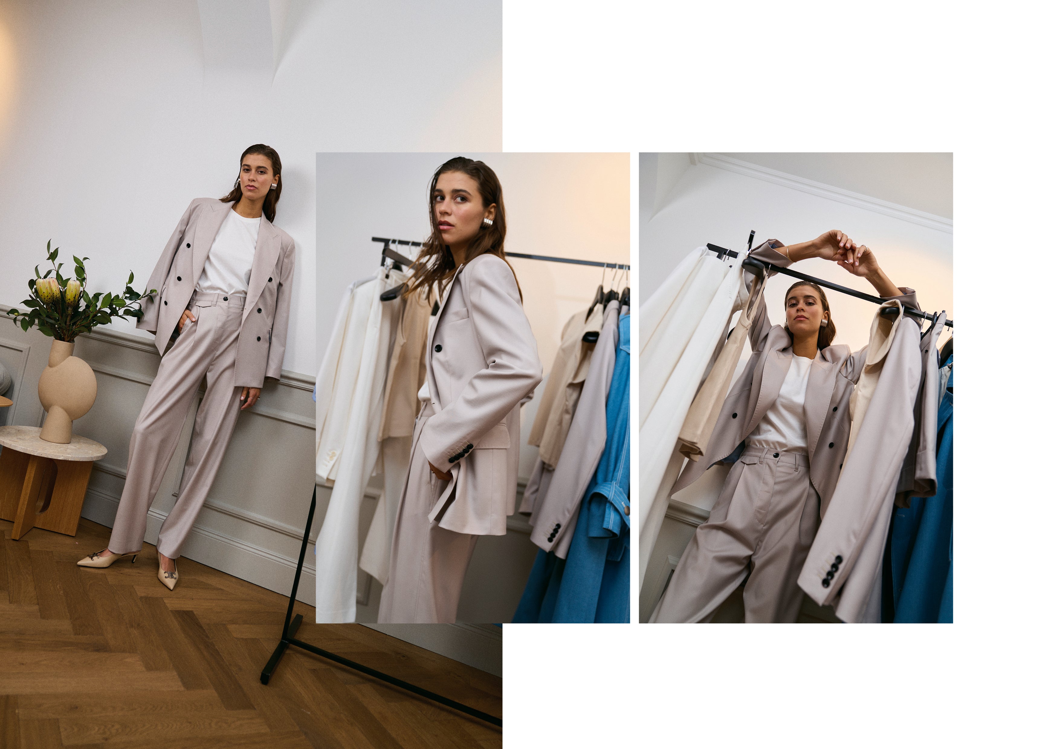 This refers to new details such as oversized cargo pockets, as well as crisp materials with a denim attitude used for the first time, as well as innovative shapes from cropped jackets to blouson styles to shorts and slim pants. There is a new ease over the entire look, even if tailoring remains the core and DNA of the line. The slightly shortened one-button jacket is sometimes available with a sharp waist, sometimes longer and more elegantly interpreted, but the masculine double-breasted suit with a striking shoulder line is also a must. The blousons are crisp and represent a certain casualness. The trousers part is just as differentiated: in addition to the Marlene styles typical of Viky Rader Studio, there are wide shapes without pleats as well as narrow, slightly flared silhouettes, smartly tailored shorts and voluminous cargos. The highlight is a slightly overlapping, double-breasted trench with a subtle oversized character. The freshness of the look is underlined by the light color image in new off-white and cream nuances as well as delicate pastels through to pigeon blue and a dash of pink. Let's blow it up with around 20 Viky Rader Studio styles in eight qualities.